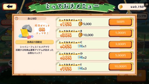 | 10,001 ~ 15,000 | ・金のどんぐり×2,500 ・ふしぎなタルトL×5 |