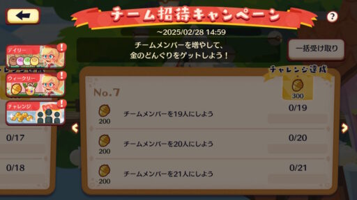 | チームメンバーを25人にしよう | 金のどんぐり×200 |