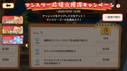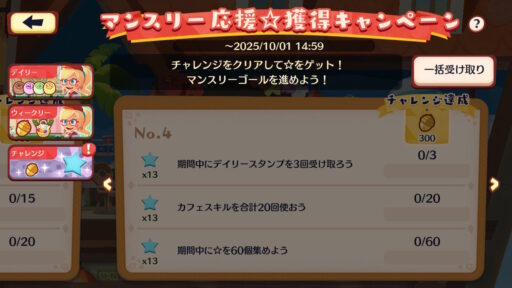 | 期間中にデイリースタンプを4回受け取ろう | ☆(青色)×15 |