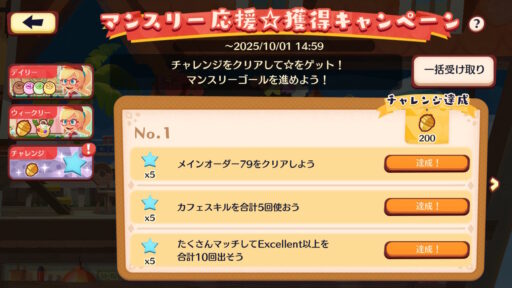 | カフェスキルを合計25回使おう | ☆(青色)×15 |