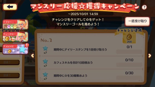 | 期間中にデイリースタンプを1回受け取ろう | ☆(青色)×7 |